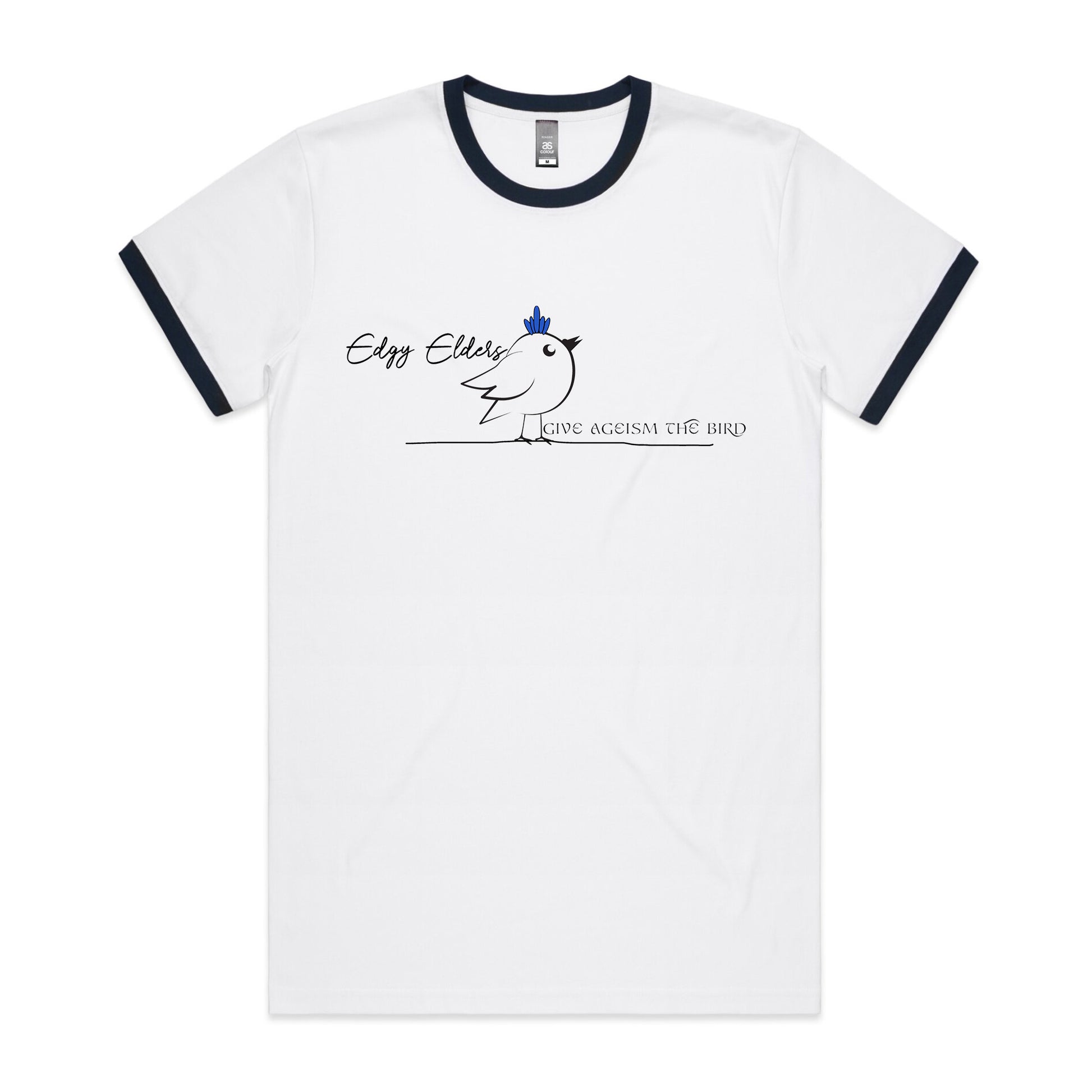 The Edgy Elders T'Shirt for women with cheeky BIRD slogan: crew neck, short sleeve in soft combed cotton, it comes in 1 colourway: white with navy crew neck and sleeve binding in 4 sizes: small, medium, large and extra large. Pre-shrunk to minimize shrinkage. (See size guide to verify your size).